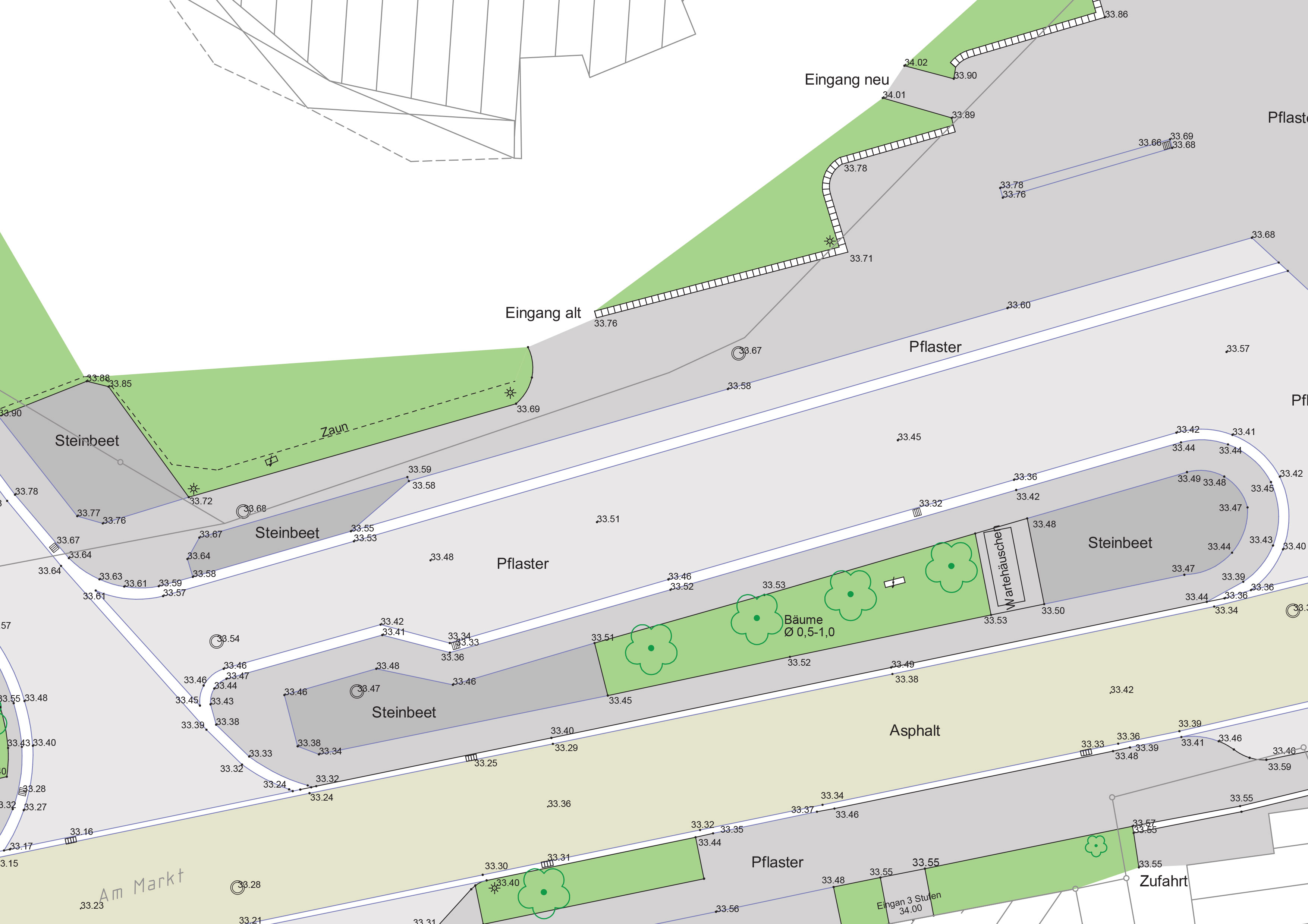 In einem Bestandsplan wird der topografisch bedeutende Bestand (Straßen, Bauwerke, Bäume, Leitungen etc. ) und vieles mehr in Lage und Höhe dargestellt. Die Erfassung erfolgt in enger Abstimmung mit dem Auftraggeber nach seinen Wünschen und Anforderungen.