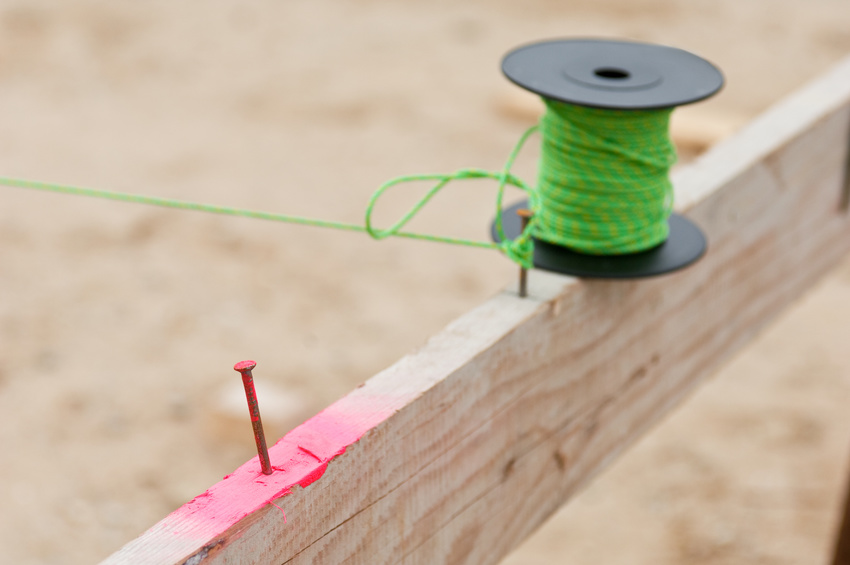 Übertragung der geplanten Baumaßnahme in die Örtlichkeit. Für den Aushub der Baugrube reicht eine Grobabsteckung. Nachdem die Baugrube ausgehoben ist, werden die Maße des geplanten Gebäudes mit hoher Genauigkeit auf einem Schnurgerüst markiert (Abjochung).